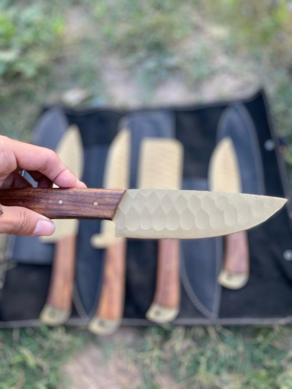 The blades are forged from high-carbon steel, offering excellent sharpness and edge retention. The natural wooden handles, secured with brass pins, provide a comfortable grip and classic aesthetic. The set is safely stored in a stitched leather roll, making it ideal for professional chefs, culinary students, and outdoor cooking.